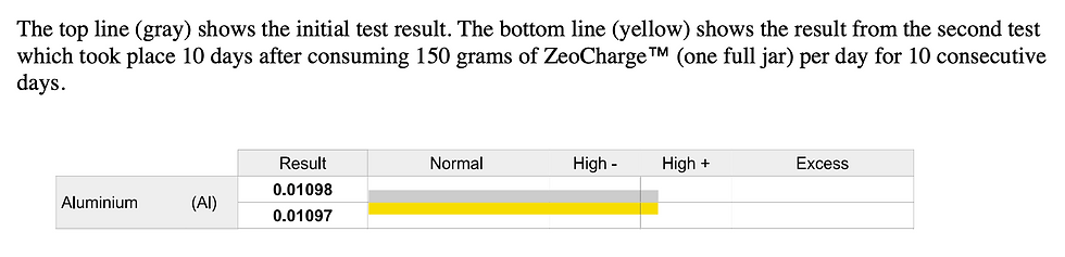 Before ZeoCharge™ was brought to market, Zeolite Labs conducted testing to ensure that the product would not increase aluminum levels in the body. To determine whether consuming a very high dose of ZeoCharge™ could lead to tissue accumulation of aluminum, a test subject consumed an entire jar of ZeoCharge™ (150g) daily for ten consecutive days—far exceeding typical use levels. Aluminum levels were measured before and after the trial, and the results showed no increase in aluminum levels in the body.